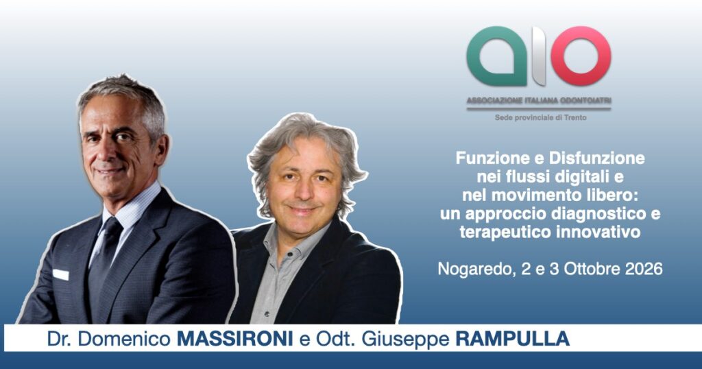 Corsi Ciclo didatticoThe Osteopathic Tinnitus Philosophy Metodo registrato dal D.O. Fabio Abrate e dal Dott. Marco Romagnoli per il trattamento degli acufeni somatosensoriali e osteopatia scopri di più…. AIO Trento: Massironi – Rampulla Funzione e Disfunzione nei flussi digitali e nel movimento libero:un approccio diagnostico e terapeutico innovativo Nogaredo (TN) il 02 – 03 ottobre 2026 scopri di più…. Approccio Osteopatico nella Sfera Stomatognatica Evidenze, Inquadramento Diagnostico, Planning Terapeutico Bologna (BO) il 14 – 15 novembre 2026 scopri di più…. Indietro